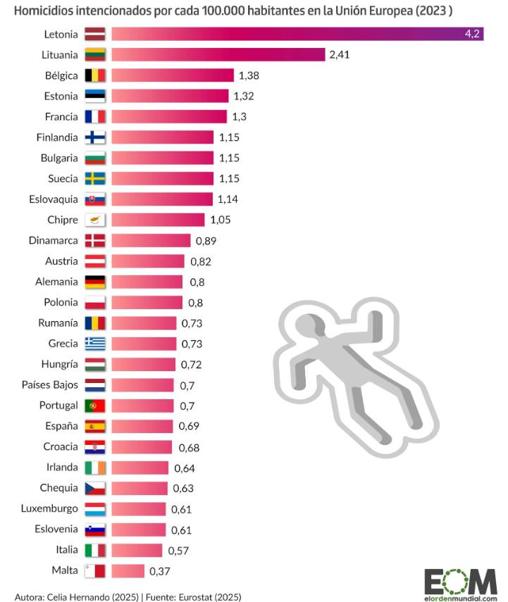 La Eurostat, la oficina estadística de la UE, registra la información de los 27 países miembros al año 2023. En el comparativo se observa que dos naciones tienen una tasa más alta que la salvadoreña: Letonia (4.2) y Lituania (2.41). Diecisiete registran un valor por debajo de uno, la mitad o menos que la salvadoreña, y los ocho restantes, entre 1 y 1.4 homicidios por 100,000 habitantes.