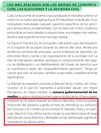 El informe Índice de democracia de la unidad de inteligencia de The Economist se publicó en febrero de 2025. El Salvador se ubica en el puesto 95 de 167 países evaluados. Desde 2019, la calificación de la democracia ha caído 24 puestos y 1.54 puntos (de 6.15 a 4.61 puntos) en el país. Lejos de ser considerado una democracia plena o total, como el presidente y vicepresidente mencionaron en distintos momentos, The Economist considera que es un “régimen híbrido”. Hasta 2020 había sido una “democracia defectuosa”.