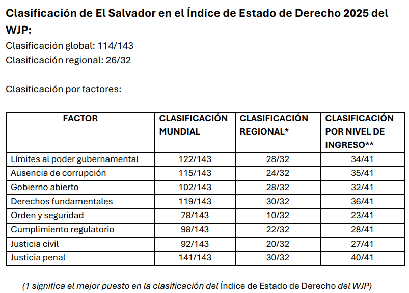 El informe Índice Estado de Derecho 2025 del WJP se publicó a finales de octubre y ubica a El Salvador en el puesto 114 de 143 países evaluados. Dinamarca está en el primer lugar y Venezuela ocupa el último escalón. En el ámbito regional, El Salvador muestra un rezago evidente en el puesto 26 de 32 países de América Latina y el Caribe. Uruguay tiene el mejor desempeño seguido de Costa Rica y Barbados.
