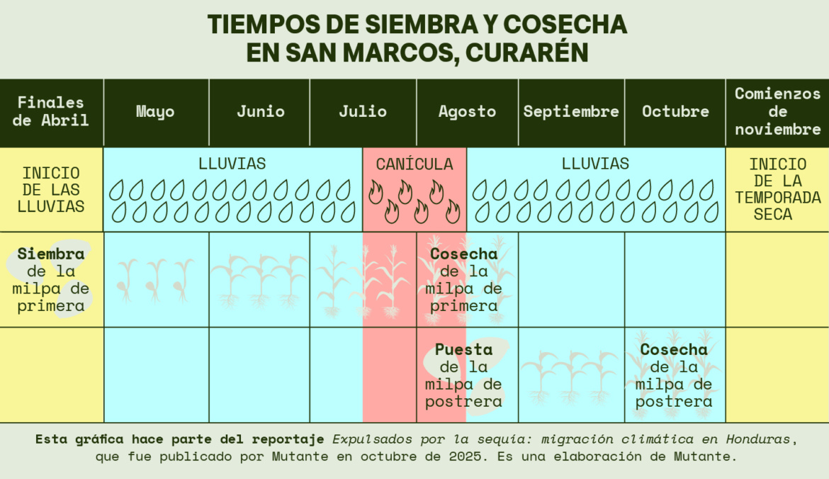 El momento de la salida de Manuel fue determinado por los tiempos de la agricultura. En el Corredor Seco Centroamericano solo existen dos temporadas: la lluviosa y la seca. Las primeras lluvias de finales de abril anunciaban el inicio de la temporada lluviosa, que se extendía hasta octubre, con una breve interrupción de cuatro semanas entre julio y agosto conocida como la canícula. Al finalizar abril se sembraba la milpa de primera, cuyos frutos comestibles maduraban en agosto, justo en la canícula. Con el retorno de las lluvias a finales de agosto se sembraba la milpa de postrera, que se cosechaba a partir de octubre y noviembre, dando paso a la temporada seca.