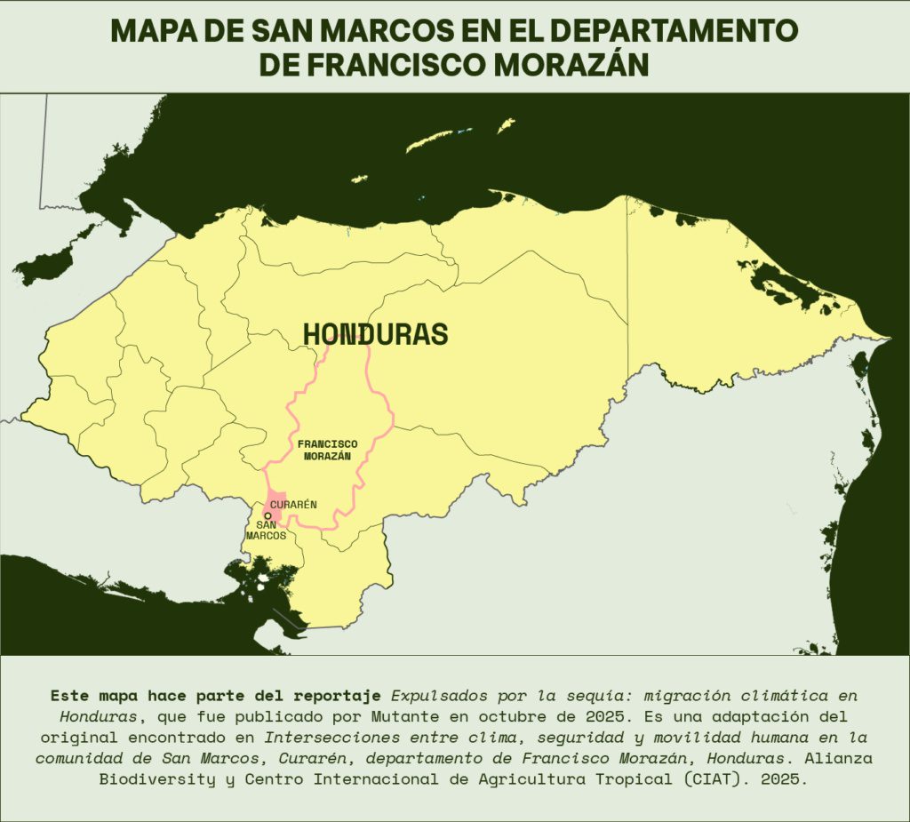 En la cima de una montaña, pasando el pequeño arroyo Maguala al suroccidente de Honduras, está el municipio de Curarén. El paisaje es montañoso, boscoso y seco: cuando llueve, verde y frondoso; cuando no, amarillo y árido. Hace parte del Corredor Seco Centroamericano, una región que Honduras comparte con los países de Guatemala, El Salvador, Nicaragua y una pequeñísima fracción de Costa Rica, definida por características climáticas y ecológicas comunes. En el mapa no aparece como un bloque uniforme, de fronteras claras y delimitadas, sino como manchas en la piel del continente.