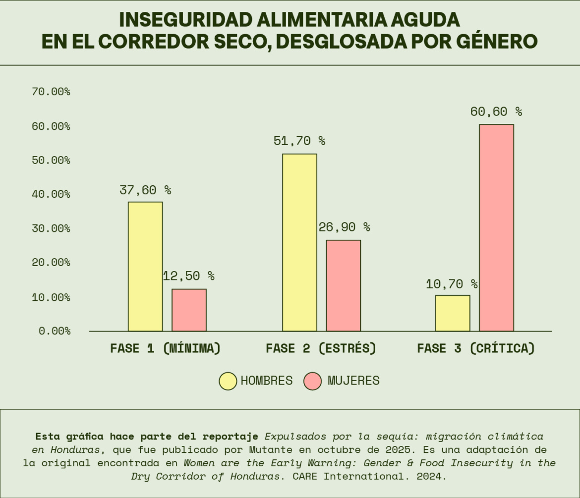El Integrated Food Security Phase Classification (IPC) clasifica la inseguridad alimentaria en tres categorías: Fase 1 (mínima), Fase 2 (estresada) y Fase 3+ (crisis o peor). El estudio Women are the Early Warning: Gender & Food Insecurity in the Dry Corridor of Honduras, realizado también en Choluteca, demostró que las mujeres enfrentan condiciones de hambre más críticas que los hombres: el 60,6 % de ellas se encuentra en la fase 3+, frente a solo el 10,7 % de los hombres. Lo que quiere decir que cuando la escasez de alimentos golpea, son las mujeres quienes cargan con el hambre más severo.