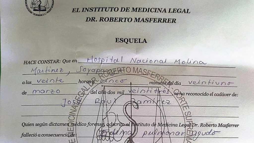 Esquela del Instituto de Medicina Legal de marzo de 2023 que establece que José Raúl Ramírez falleció de “edema pulmonar agudo”. El reporte médico que envió el Hospital Psiquiátrico a la PDDH, anexado en el expediente LL-0010-2023 de noviembre de ese año, la contradice. (Foto cortesía).