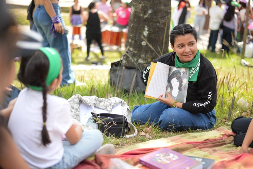 Al final del recorrido, las zonas verdes alrededor de la fuente se llenaron de pequeños círculos de mujeres. Hubo talleres de batucada, lectura de cuentos feministas para infancias y espacios para debatir sobre la situación del país.