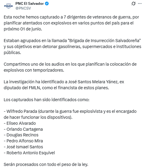 En la noche del 30 de mayo, la Policía Nacional Civil tuiteó: “Esta noche hemos capturado a 7 dirigentes de veteranos de guerra, por planificar atentados con explosivos en varios puntos del país para el próximo 01 de junio”.