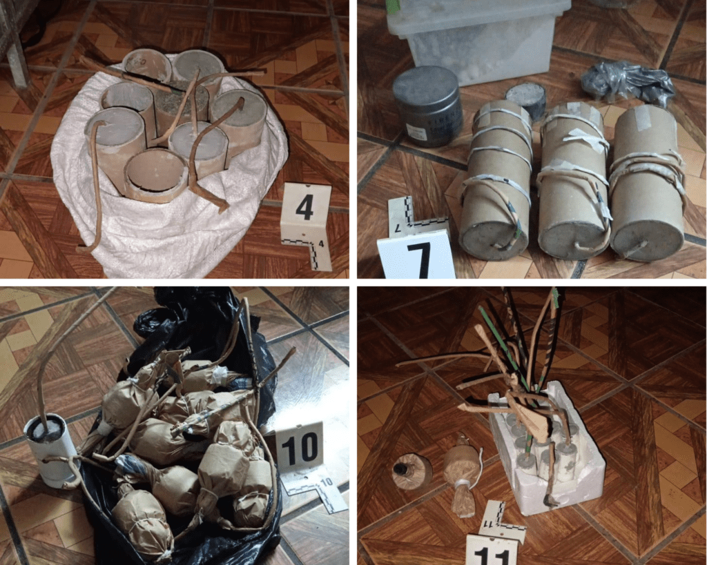 La lista resume que fueron encontrados ocho cilindros de cartón comprimido de aproximadamente 15 centímetros, sellados con cemento y con mecha pirotécnica; otros 10 de dos pulgadas de largo (5 centímetros), con mecha y revestimiento de papel de empaque; y ocho más en tubos de plástico PVC de una pulgada (2.5 centímetros), con mecha, sellados con cemento en sus extremos. También dijo haber hallado sulfato de amonio y una mezcla de clorato de potasio, azufre y carbón vegetal, que es pólvora corriente, además de “insumos y materiales que servirían para la fabricación artesanal de los explosivos”.